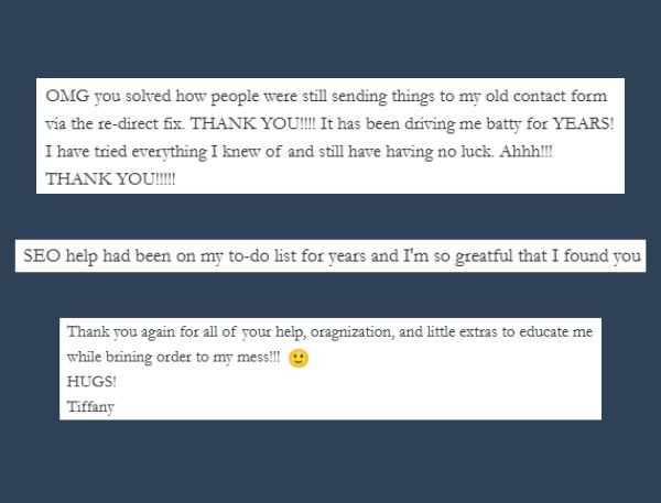 “SEO help had been on my to-do list for years and I’m so grateful I found you! Thank you for all your help, organization, and little extras to educate me while bringing order to my mess!”
